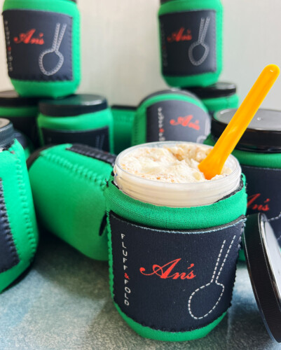Purchase your Fluff & Fold 3.0 which comes with a lid, compostable spoon, and custom An's Koozie to keep your hands warm and better insulate the gelato so it stays cold longer. Pro Tip: you can purchase a metal An's taster spoon if you'd prefer that instead of our tricolor compostable spoons.